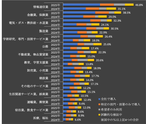 一方、運輸業や郵便業、各種サービス業では導入率が10%前後に留まっており、業種間の格差も顕著に現れている。この結果は、業種特性や既存の業務プロセス、技術への理解度などが生成AI導入に大きく影響していることを物語っている。
