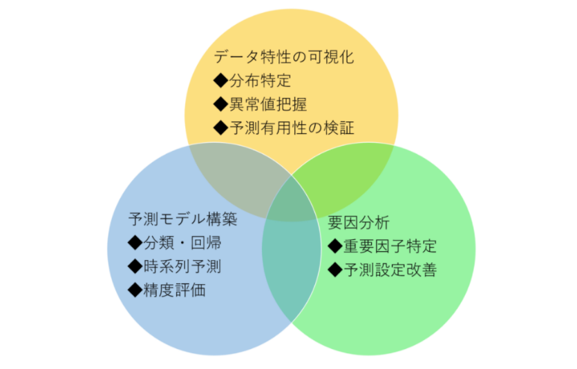 お手持ちのデータに対する、特性可視化/予測モデル構築/要因分析など、基本的な統計分析〜機械学習適用まで、幅広く対応可能です。
