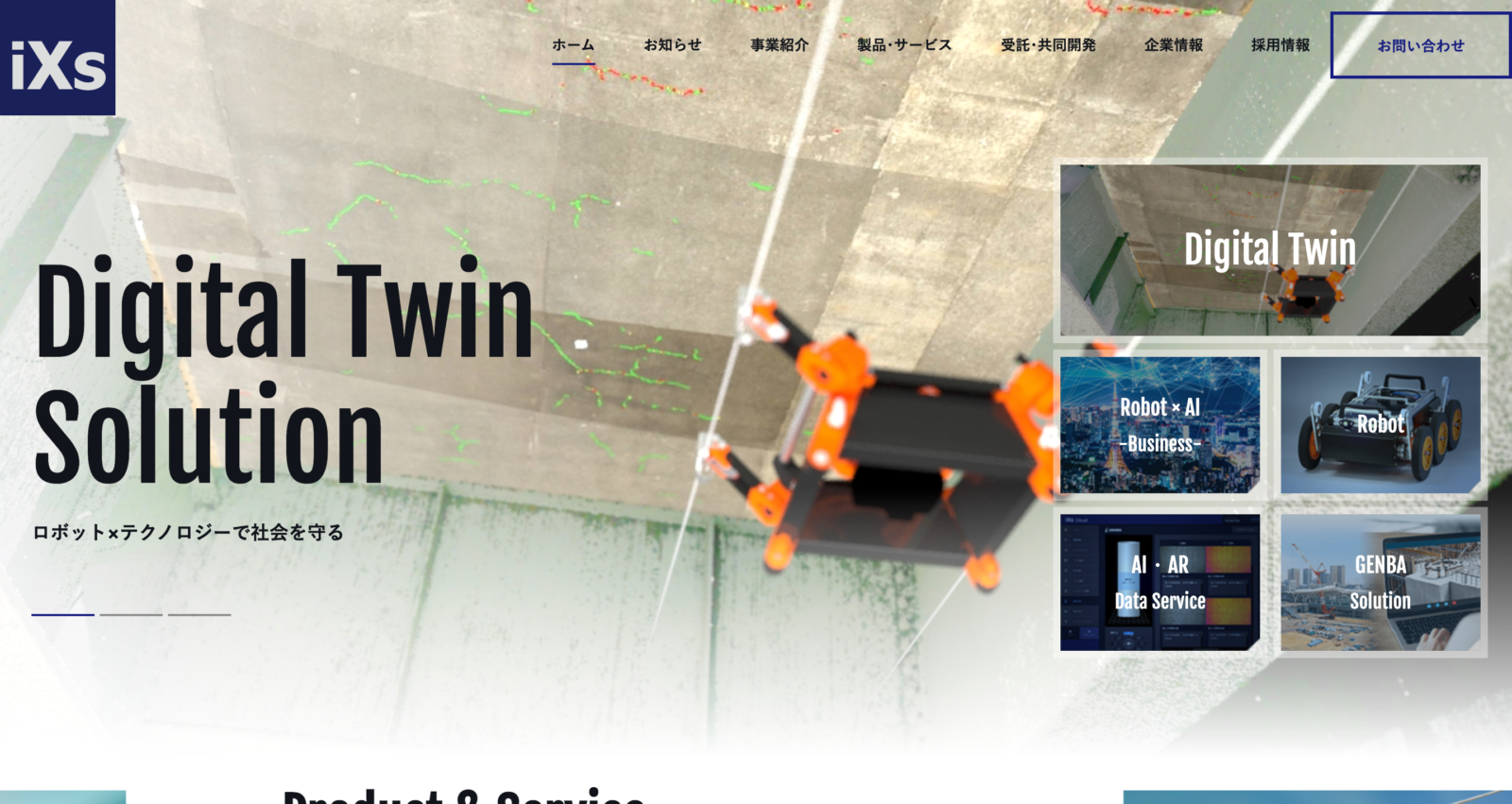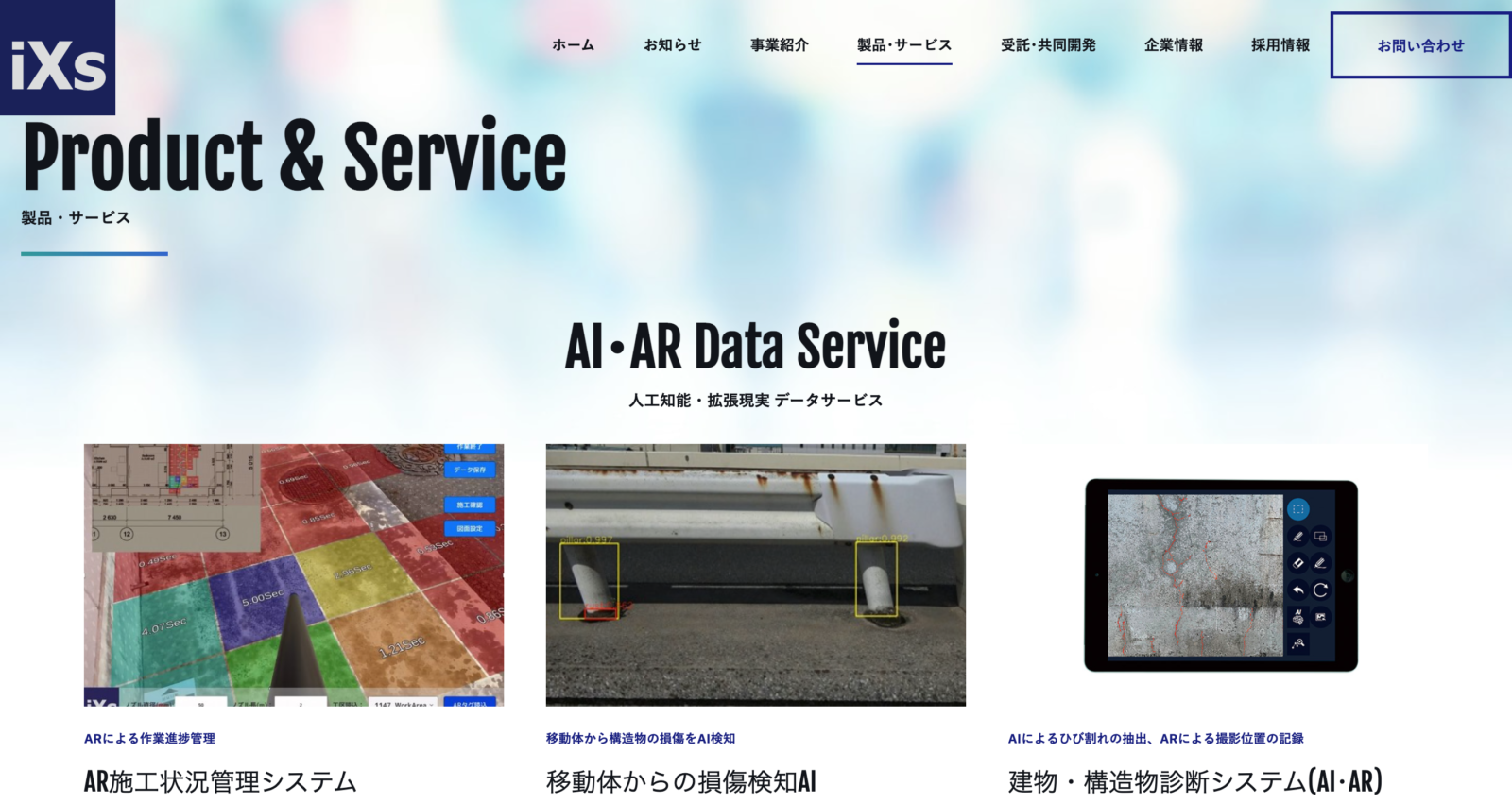 取得した写真等のデータから損傷位置をAIで抽出する「点検データの記録および解析サービス」および「構造物のひび割れ・損傷抽出AI」の提供や、BIM/CIMと呼ばれる構造物データをソフトウェアに取り込み、3次元空間内でロボット位置を制御できる「iXs BIM/CIM Link Solution」、ロボットの自律走行プログラムを開発し、障害物を回避しながら目的位置へ自動で移動する行動計画を立案できる「iXs SLAM Solution」などのAIサービスを提供しています。