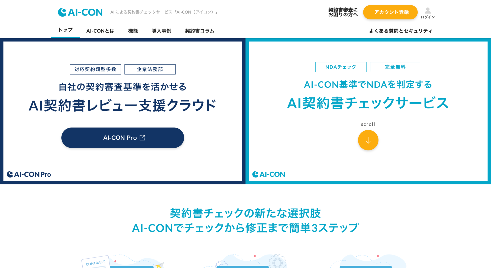 契約書をアップロードするだけで、AIが契約書をチェックすることができ、チェックできる契約書は売買契約書や秘密保持契約書など全16種類に対応しています。