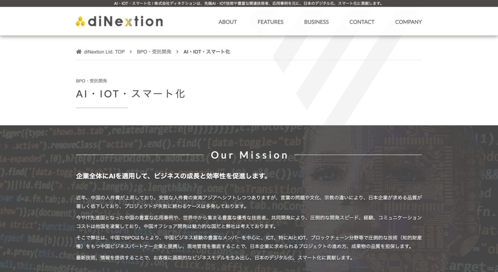 中国でのBPO、ビジネス経験の豊富なメンバーを中心に、AIとIOT、ブロックチェーン分野等で圧倒的な技術(知的財産権)を持ち、世界中から集まる豊富な優秀な技術者が在籍する中国ビジネスパートナー企業と提携し、共同開発による圧倒的な開発スピード、経験、低コスト化などのメリットを活かし、現地管理を徹底することにより、日本企業に求められるプロジェクトの進め方、成果物の品質を担保しながらAI開発を支援します。