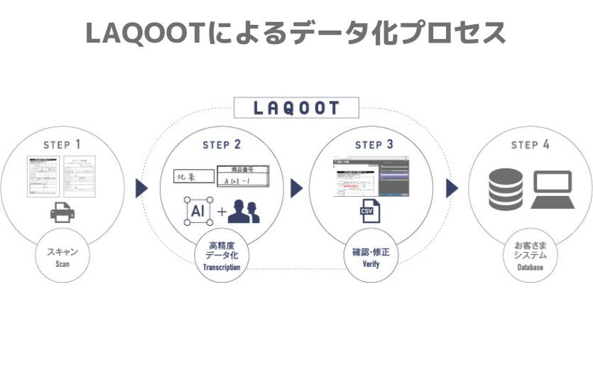 理論上識字率100%の高精度データ化を実現します。紙帳票のデータ化作業でお困りなら、LAQOOTをぜひご利用ください。