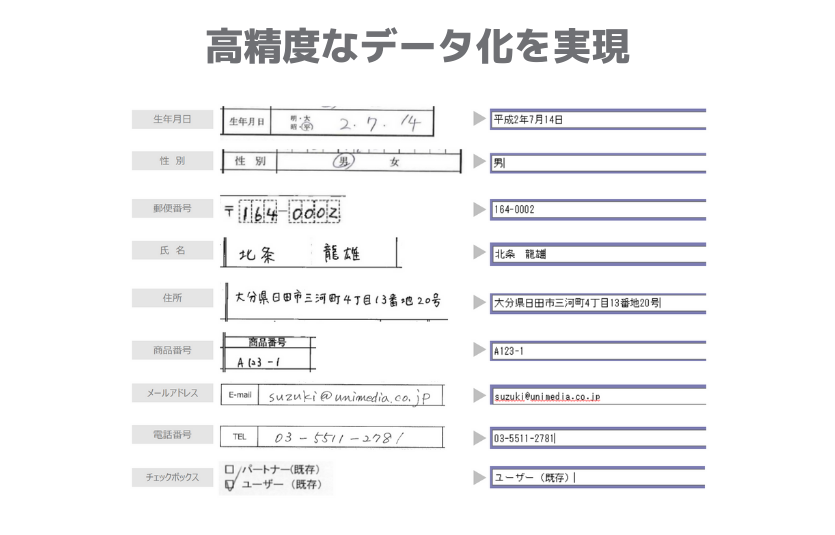 申込書や注文書、アンケート用紙など、紙の帳票の文字データ化を高精度で実現するAI OCR。