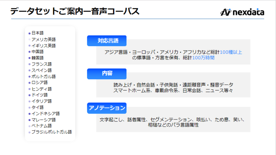 ・日本語・英語・フランス語など30万時間多言語音声認識・音声コーパス提供