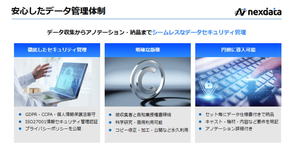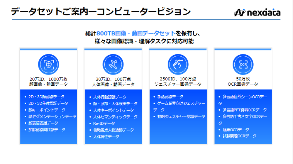1.お客様のニーズに応じて、顔識別・物体検出、スマートドライブ、自動翻訳・OCR、音声、LLM、自動運転、フィジカルAIなどあらゆる種類のデータセットを迅速に納品可能です。