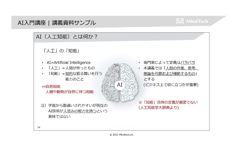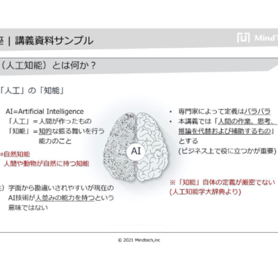 ビジネス教養としてAIの技術概要や注目されているポイントを理解し、新聞や雑誌などに書かれている内容を最低限理解することができるようになるプログラムです。