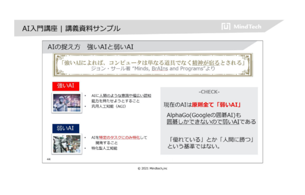 わかりやすい例から導入し、AIの定義やAIにどのようなものが含まれるか、AIによって何がどのように変わったかを理解します。