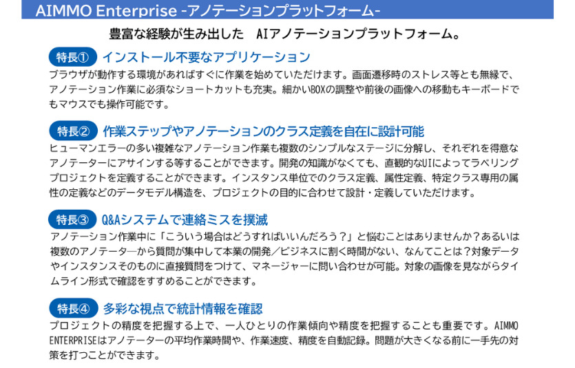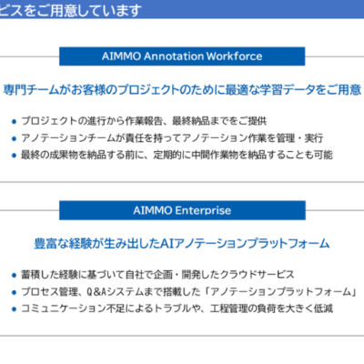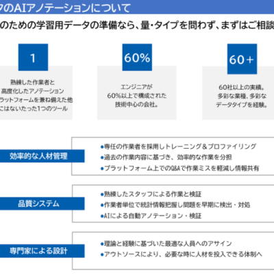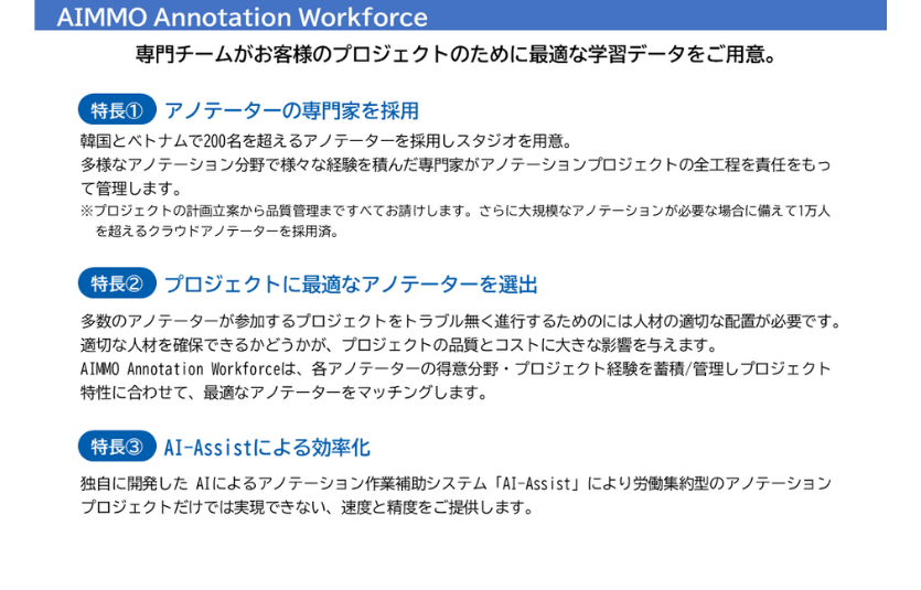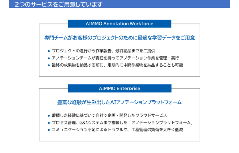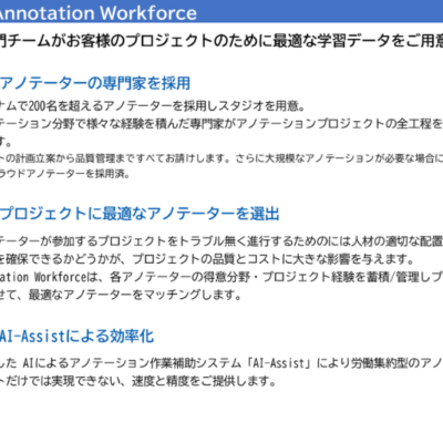 AI向けデータ作成サービスであるアノテーションサービス「AnnotationWorkforce」および、アノテーションプラットフォーム「Enterprise」をご提供しています。