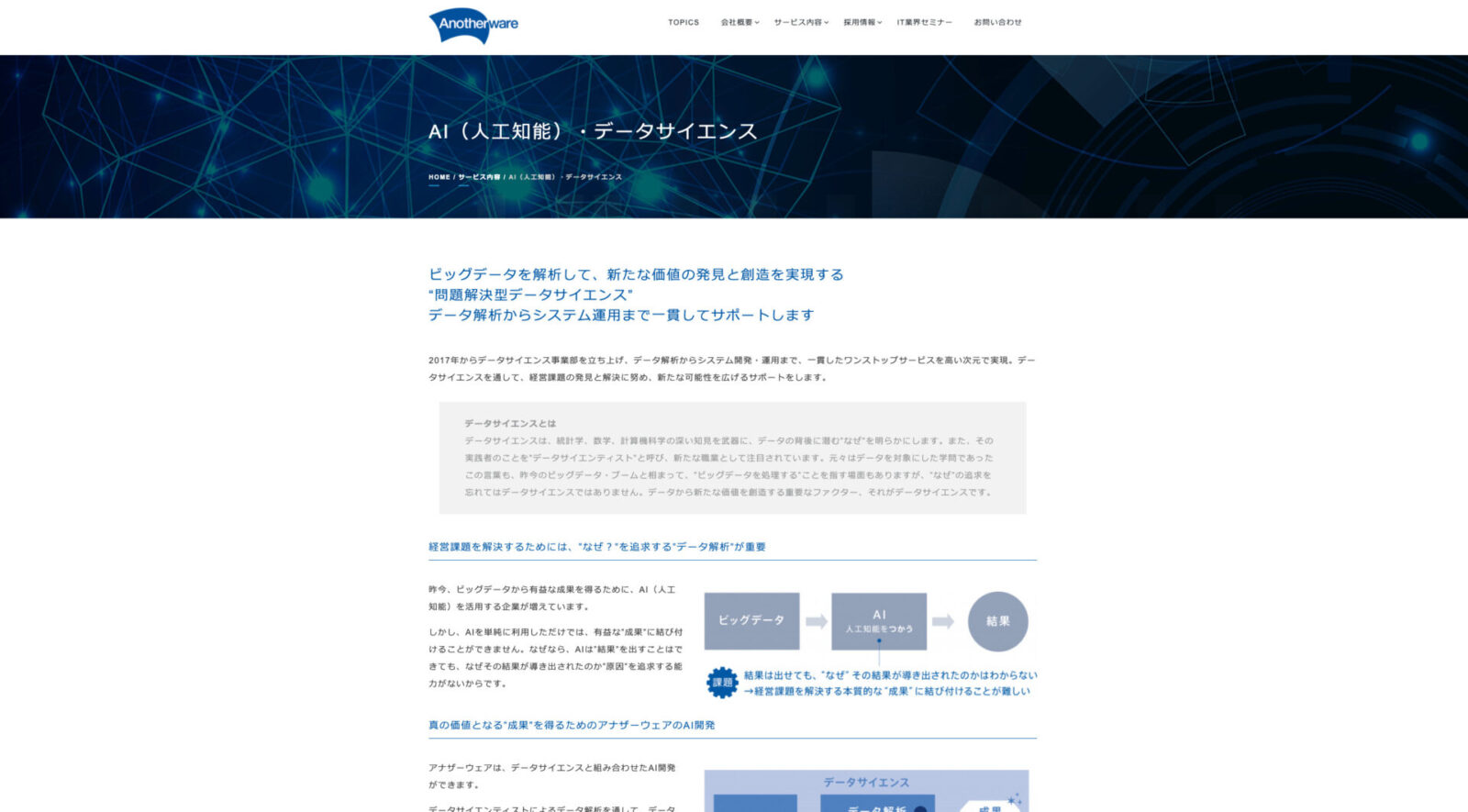 データ解析からAIシステム開発・運用まで、一貫したワンストップサービスを高い次元で実現し、データサイエンスを通して、経営課題の発見と解決に努め、新たな可能性を広げるサポートを行います。