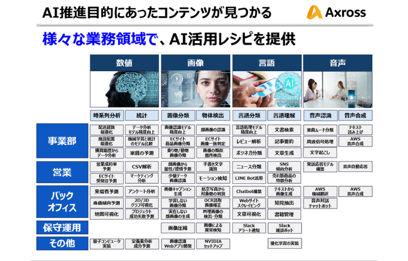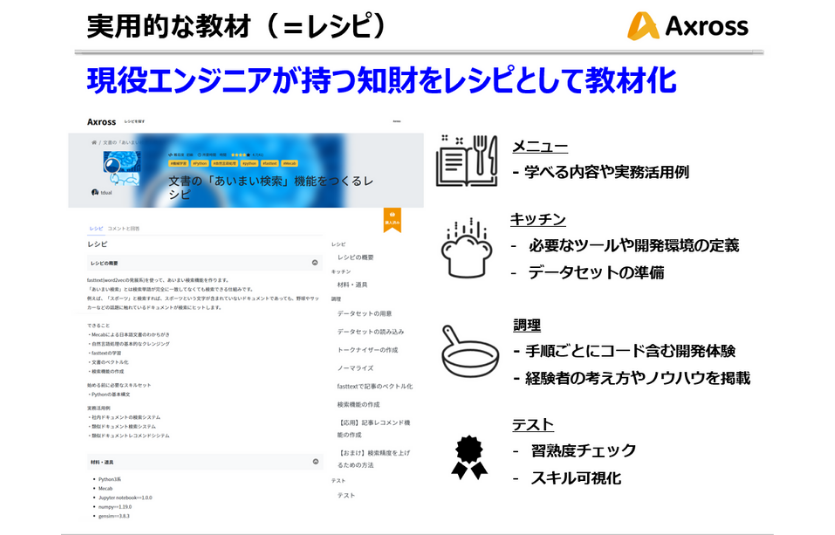 基礎知識やプログラミング言語/構文を学んだが、実務未経験のエンジニア初学者が、Axross Recipe(アクロスレシピ)の実践的な教材を繰り返し学ぶことで、業務で活かせる知識・ノウハウを習得できます。業界・職種問わず豊富なテーマでのAI・機械学習の活用事例が教材化されており、受講者の目的/目標に合ったスキル習得ができることが強みです。