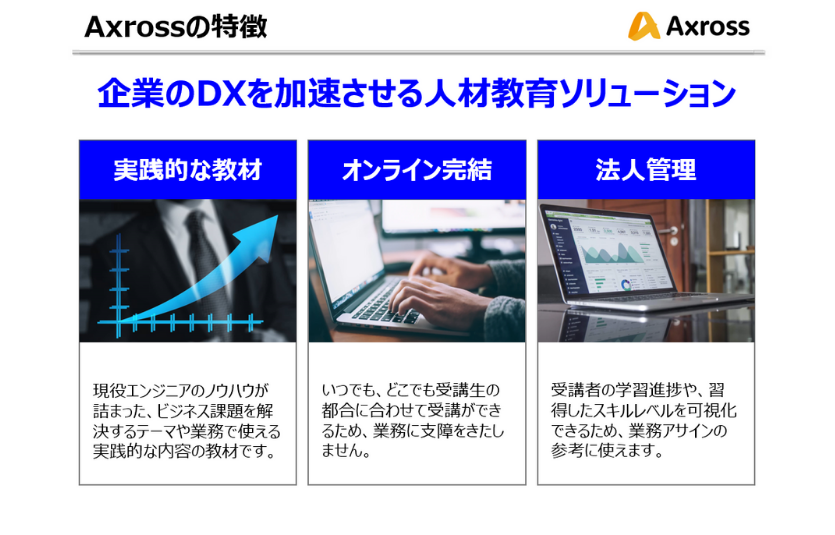 法人プランでは、Axrossのすべての教材を定額学び放題でご提供しています。法人様のDX推進の目的に合った教材/学習コースを選んで受講することができ、管理者は受講者の学習進捗やスキル習熟度を確認することができます。現在は、法人プランの無償トライアル募集を行っていますので、是非お問合せいただけますと幸いです。