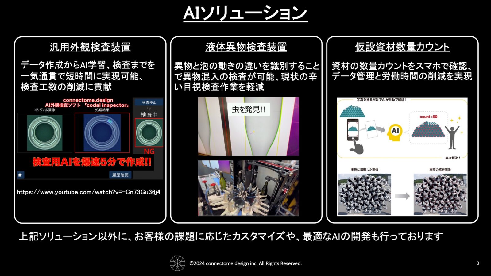 当社は課題解決のスペシャリスト、高い技術力のAI開発者はもちろんのこと、パートナーと協力してAIシステムの開発も行えます。AIベンダーの多くはPoC以降の導入に向けた実装は他社に任せるというケースが多いですが、当社は装置会社と連携し、ハード・ソフト含めたシステムとして提供します。