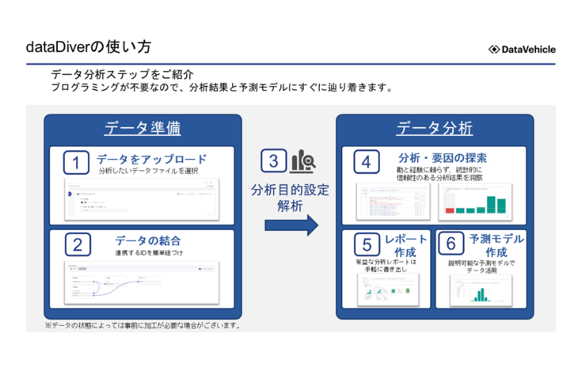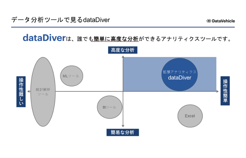 AI・機械学習時代のデータ分析では予測や要因の探索が求められます。dataDiverはそのような高度なデータ分析をノーコードで実現する拡張アナリティクスツールです。