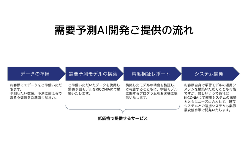 取り組んできたプロジェクトの中でもニーズの多い需要予測に関しては、様々な業界・業種においてプロジェクトを成功してきたことから、現在までに多くのナレッジやノウハウを蓄積し、より効率的に最適な需要予測モデルの構築(研究と実装)を実施する仕組みを構築いたしました。今まで同社においても数百万円、同業他社では数千万円かかるこのAI開発(PoC)費用を低価格で提供することが可能となりました。