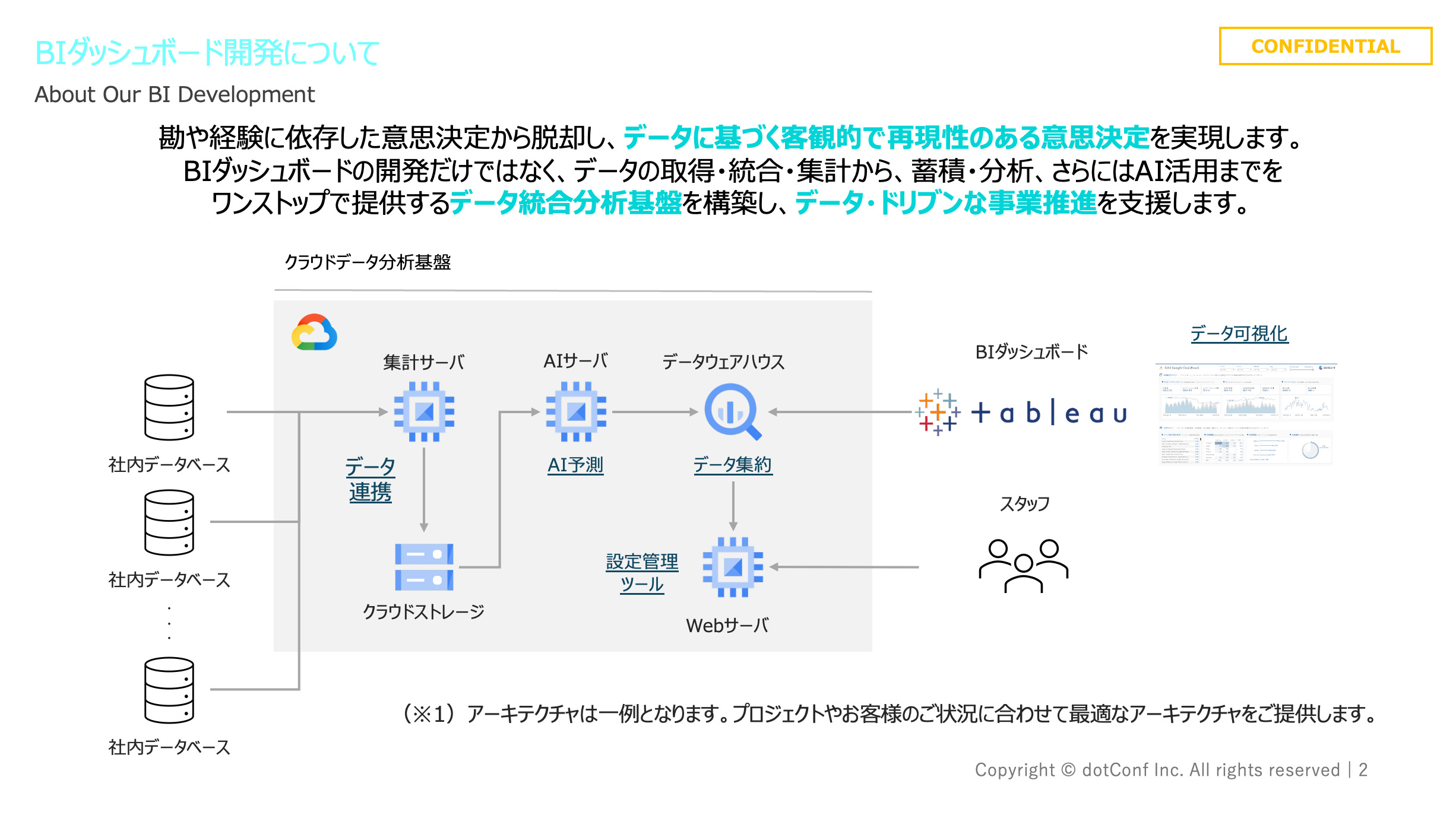 当社は、BIダッシュボードの開発を中+D21心に、データ基盤の構築から分析・AI活用までをワンストップで支援します。特に Tableau・Looker Studio に強みを持ち、直感的で美しいデザインと高いユーザビリティを兼ね備えたダッシュボードを提供。単なる可視化にとどまらず、データ収集・集計・格納(ETLパイプライン)、データウェアハウス構築、分析、AI活用まで包括的に対応します。