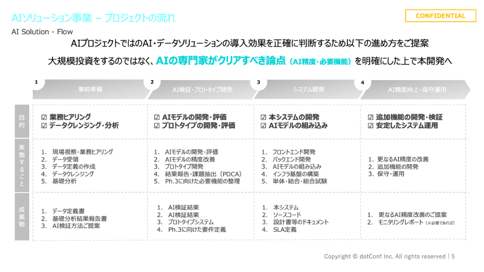 PoCの段階では、単なる技術検証ではなく、実際の業務データを用いたプロトタイプ作成も行い、開発するAIシステム像を見える化。担当者の不安を払拭し、商用化へスムーズにつなげます。