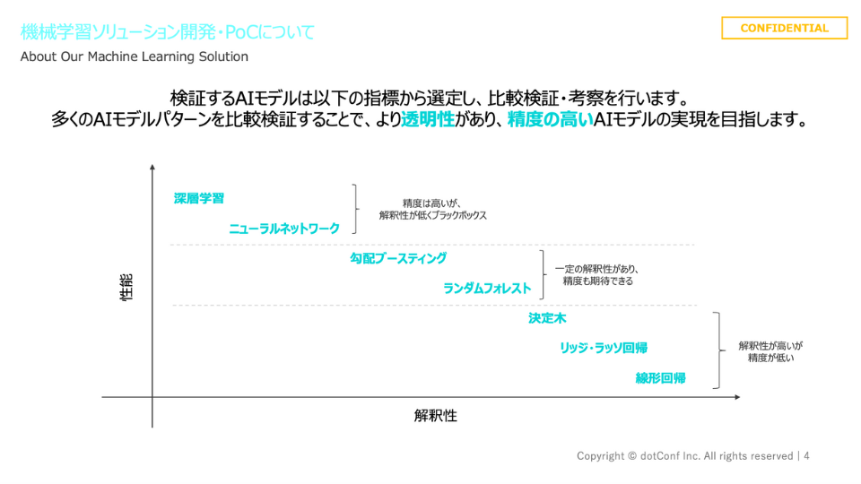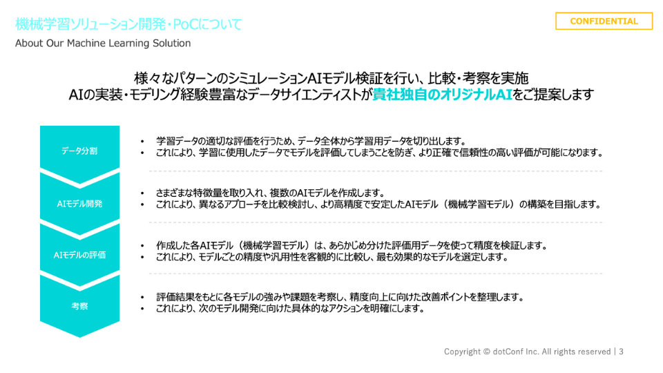 PoCでは、機械学習モデルの開発・評価だけではなく、目指すAIシステム像を見える化できるプロトタイプを開発。効果を“見える形”に。導入の可否を判断しやすい状態を作り出し、安心感を提供します。