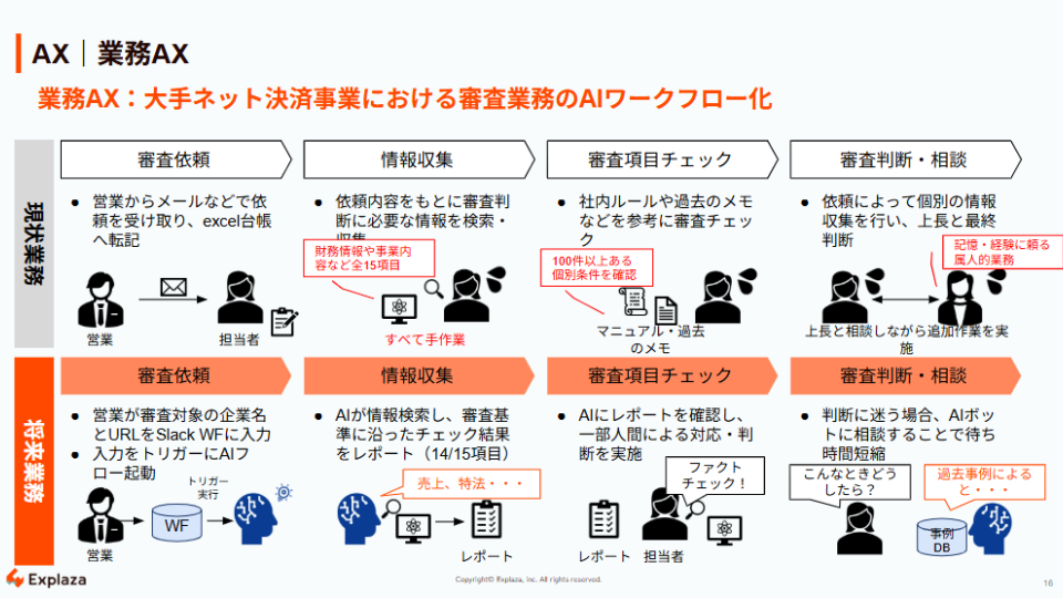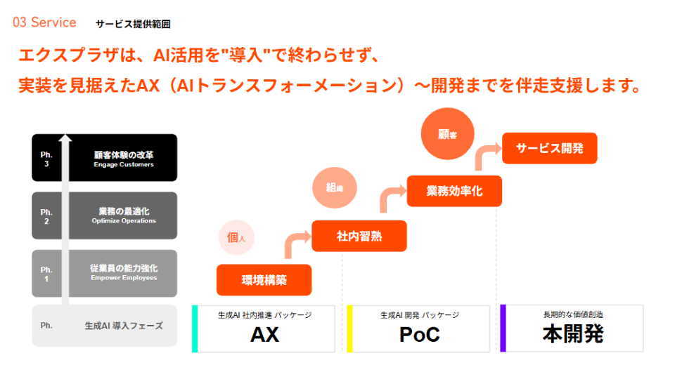 エクスプラザは、AI活用を"導入"で終わらせず、実装を見据えたAX(AIトランスフォーメーション)を伴走支援します。