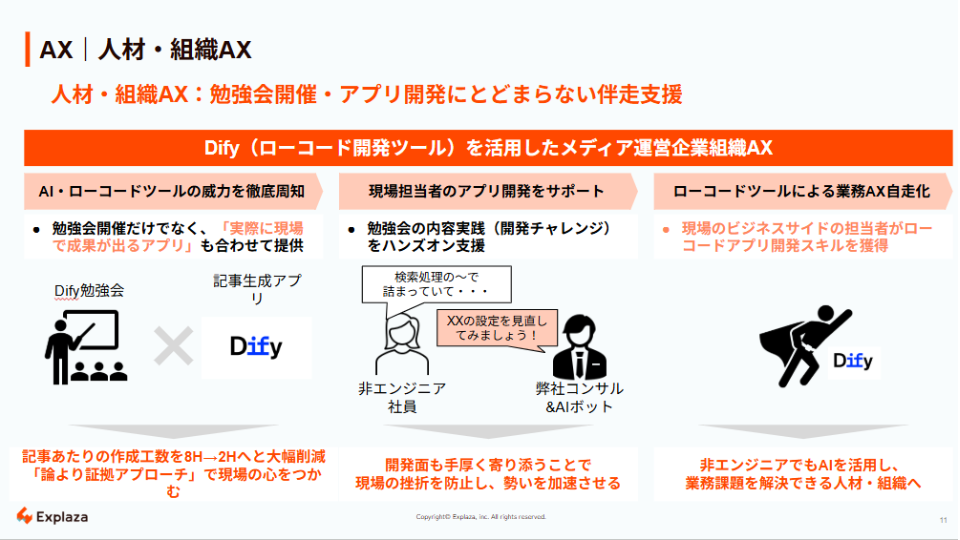 ・業務AXの自走化:ビジネスサイドの担当者がDify、CursorをはじめとするAIプラットフォームの開発スキルを獲得3経営層も巻き込み、トップダウン/ボトムアップの両面で事業・組織全体のAXを支援【AX戦略】