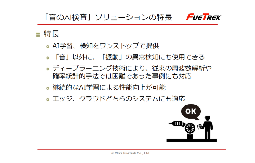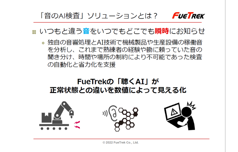 独自の音響処理とAI技術による異音検知ソリューション!点検・検品業務や状態監視を聴感検査に頼らない異常検知技術で自動化と省力化をお手伝い!