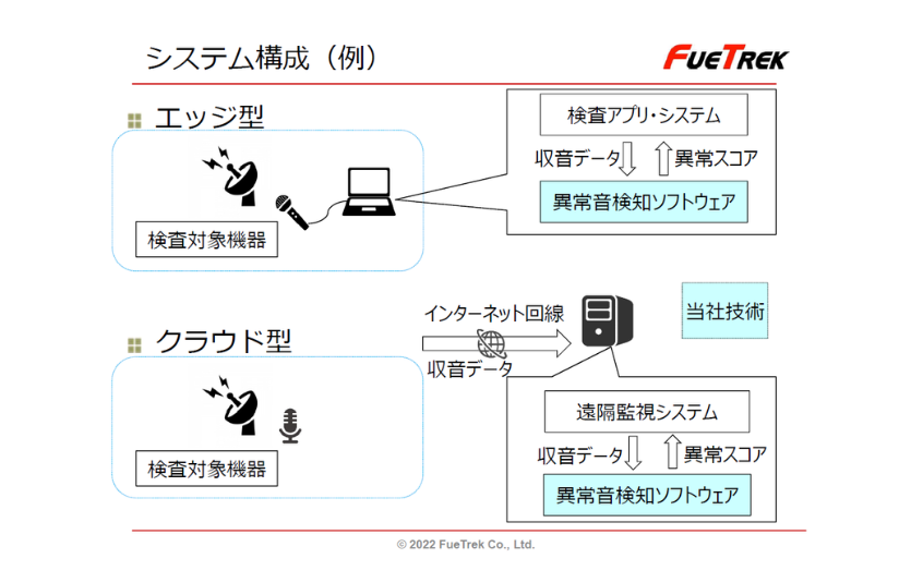 検査対象機器の稼働音を与えると、正常状態との違いを数値(異常スコア)として出力するソフトウェア(AI検査ライブラリ)を提供し、点検・検品業務や状態監視の高精度化や自動化・省力化を支援します。これまで熟練者の経験や勘に頼っていた音の聞き分けや、時間や場所の制約により不可能であった検査を、フュートレックのAIによる異常検査によって実現しませんか。