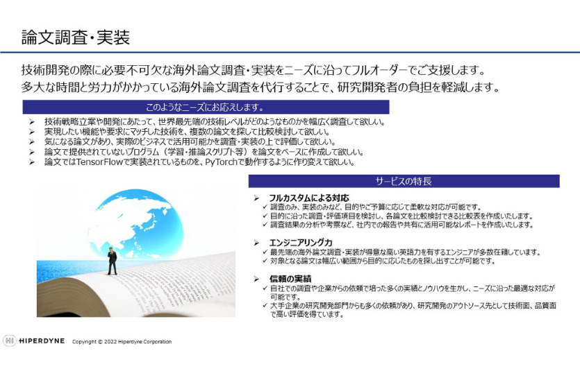 当社では、新規事業開発コンサルティングによる事業の戦略立案、お客様のご要望を満たすためにアセスメントを実施し、技術的な実現可能性、最適な技術調査、必要なデータの見極めなどを行った上で開発を成功に導くようご支援しています。3海外論文調査・実装をフルオーダーでご支援