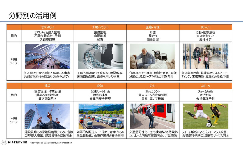物体検出、ヒトとモノの同時認識(特許取得)、動作推定などの技術を活用し、さらに開発内容に合わせたアノテーションを実施することで高精度、且つロバスト性の高いAIモデルを開発。NVIDIA社DeepStream SDKとJetsonを使用した高速・リアルタイムのエッジAIの画像解析にも対応