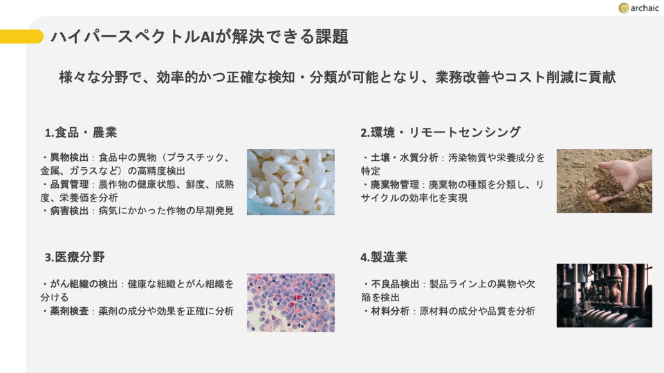 このシステムは、食品、農業、医療、環境などさまざまな分野で、効率的かつ正確な検知・分類が可能となり、業務改善やコスト削減に貢献します。