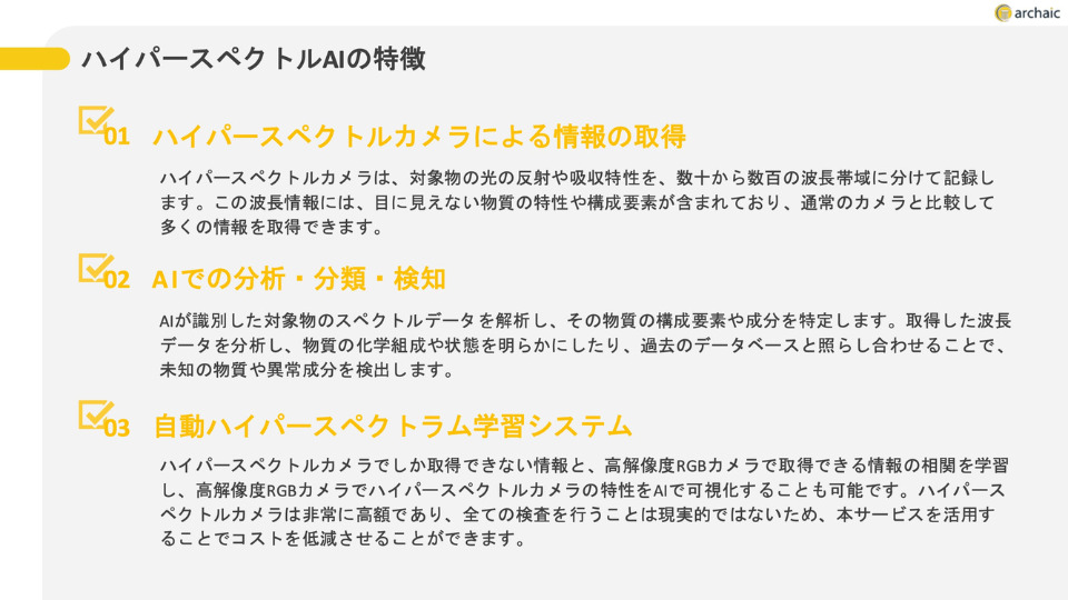 「ハイパースペクトルAI」は、光を非常に細かく分光するハイパースペクトルカメラによって撮像した3次元的なデータの中から特徴量を抽出し、通常のカメラでは不可能な高精度の分類や頑健性の高い予測を行うことができるAIシステムです。