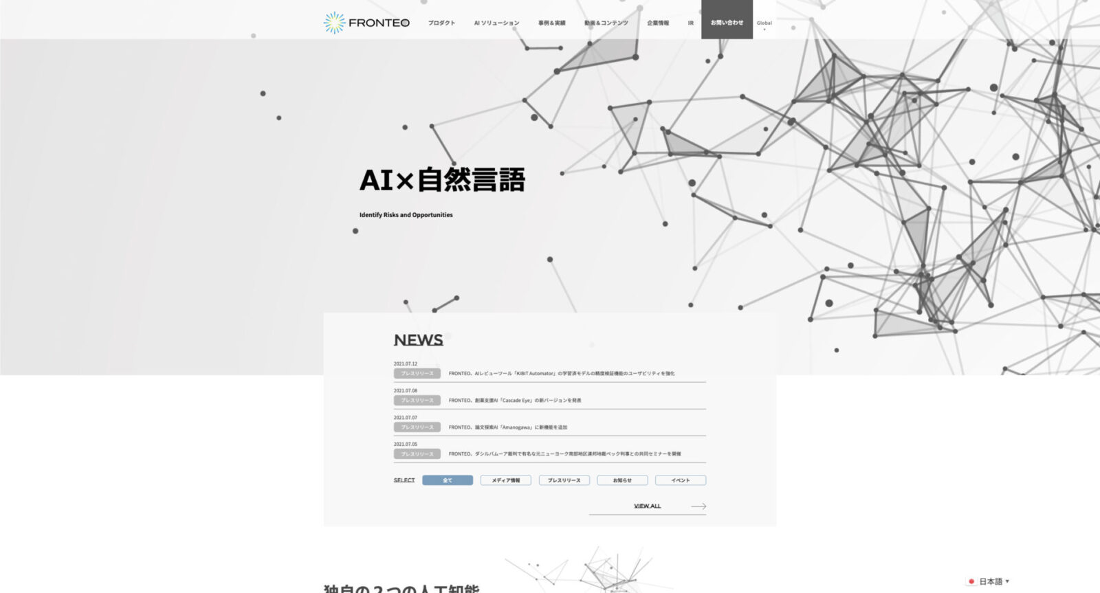 独自の機械学習アルゴリズムを用いていることで、小さな計算資源と少量の教師データによる短時間でのテキスト解析が可能となり、キーワードのみに頼らず、専門家や勘の優れた人が備える“暗黙知”を再現します。また、異なる表現でも類似性や文脈を捉え、文章の特徴量を抽出できるなど、高い自然言語処理技術と実践的な結果を得られる点が高く評価されています。