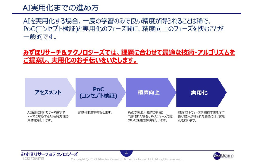 お客さまのAI活用・導入に関する進捗度合に合わせ、AIモデル開発に留まらず、PoC支援や技術調査支援の他、お客さまの業務上の課題の整理や解決策(仮説)設定といった、超上流工程からの支援が可能です。