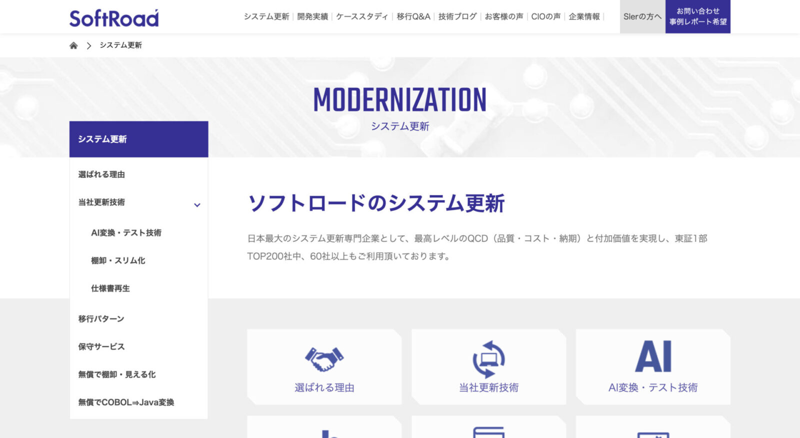 日本最大のシステム更新専門企業として、最高レベルのQCD(品質・コスト・納期)と付加価値を実現。東証1部TOP200社中、60社以上で導入実績