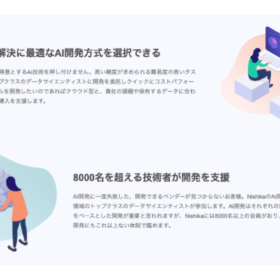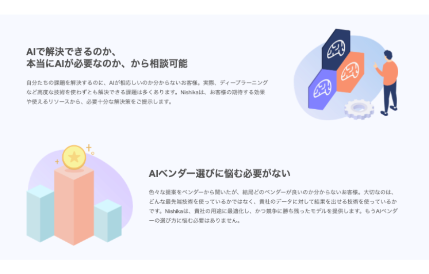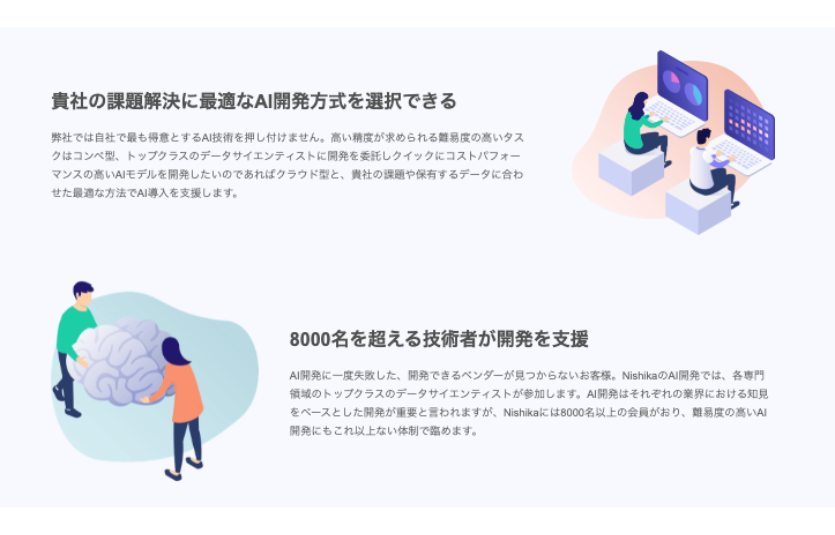 Nishikaはデータ分析コンペティションを中心としたプラットフォームを通じた最高精度のAI開発、ビジネスコンサルティングに豊富な経験を持つメンバーとトップクラスのデータサイエンティストの協業によるAIの受託開発を提供しています。