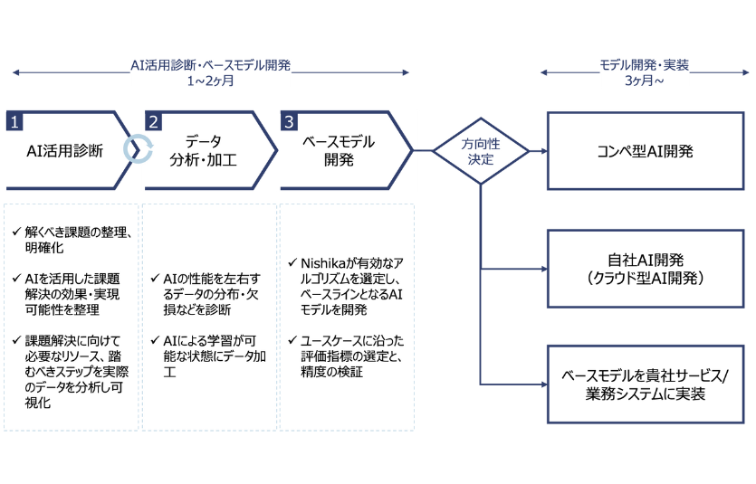 NishikaはAI開発における課題整理や要件整理、実データを用いたベースモデル開発から支援します。コンペティション方式に限らず、様々なAIモデルの開発方式を提供しており、無料の簡易PoCやデータ分析を通じて、クライアントの課題解決に最適な開発方式を提案・実現します。