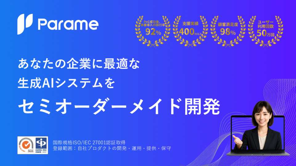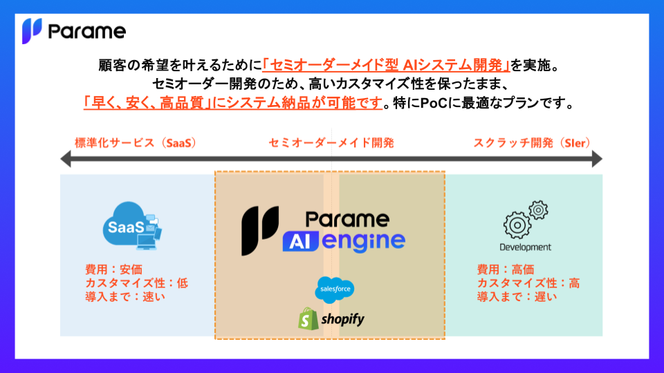 貴社の希望にフルカスタマイズしたAIシステムを、高品質に、安く、スピーディーにご提供するために、AIの共通開発基盤『Parame AI engine』を独自開発しております。その共通基盤を活用した『セミオーダーメイド開発』により、お客様のあらゆる希望を実現いたします。