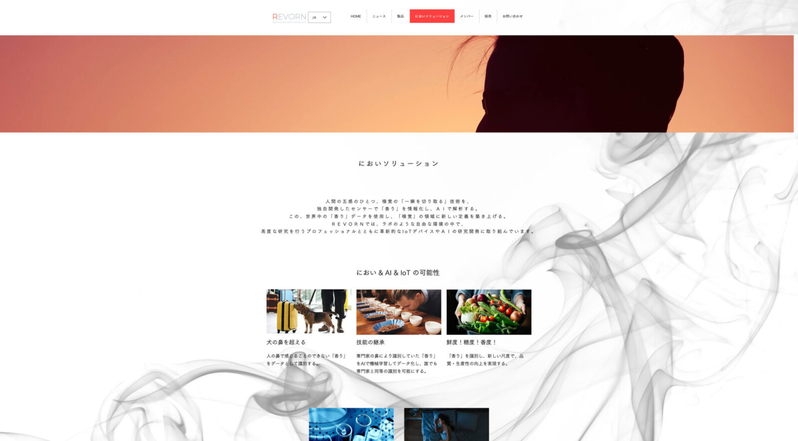 人間の嗅覚の技術を、独自開発のセンサーで匂いを情報化し、QDA法による分析で再現したAIで解析します。この匂いのデータを活用し、嗅覚の領域で様々な研究を行っています。