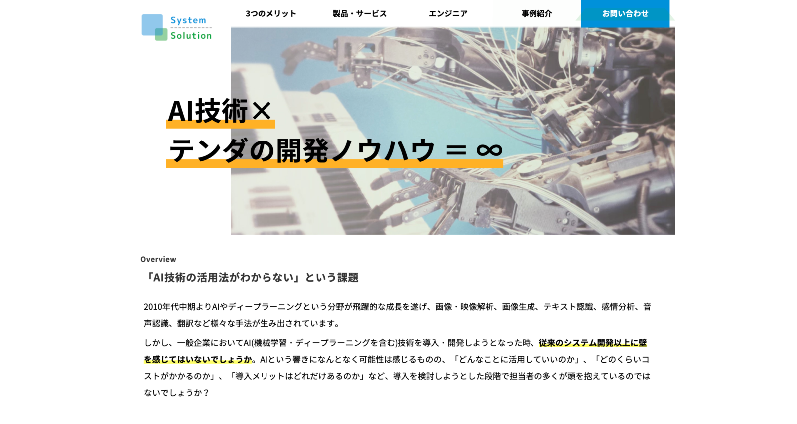 AI技術(機械学習・ディープラーニング)の導入・開発時に発生する活用方法やメリットがわからないという課題に対して、自社製品開発や、様々な請負開発を行い、その中で発生したお客様からの相談や、システム開発、運用、保守を行ってきた経験を活かして企画提案、そして実際のAI開発を行います。