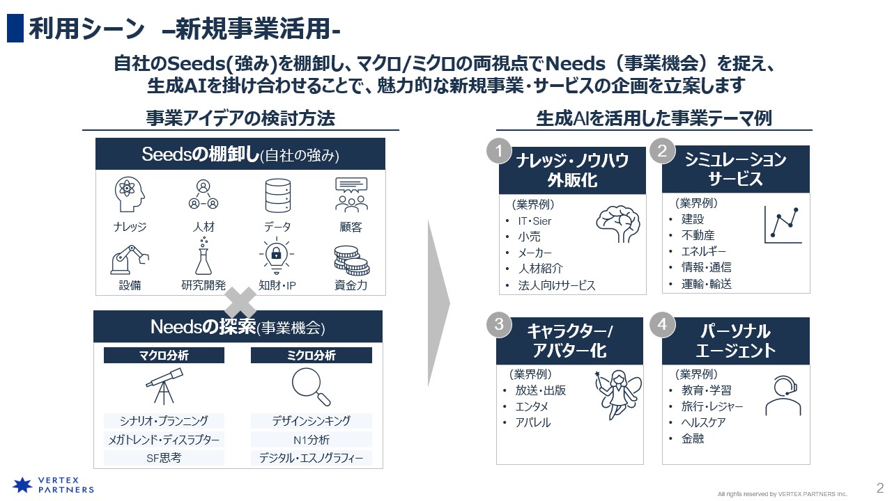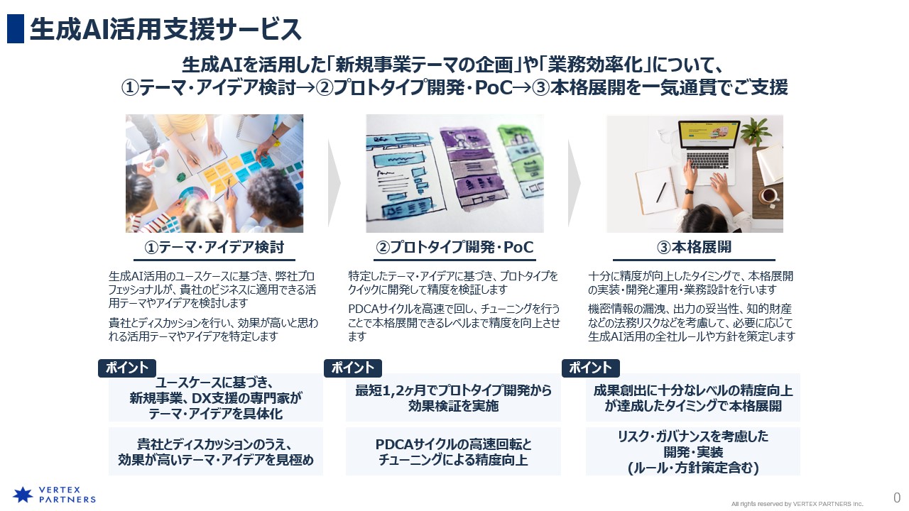 ベルテクス・パートナーズの生成AI活用支援は、アイデア創出段階からプロトタイプ開発、そして最終的なシステム実装・運用設計とルール策定に至るまで、すべてのフェーズをワンストップで支援することが特徴です。