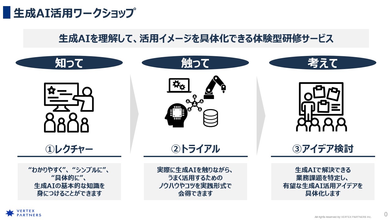 ベルテクス・パートナーズは、前例のないテーマや難易度の高い課題にも柔軟に対応できるコンサルティング力が強みです。業務フロー全体の分析やデータ基盤の整備など、汎用的な手法に頼らず、個社ごとに最適な生成AI活用策をオーダーメイドで提案します。