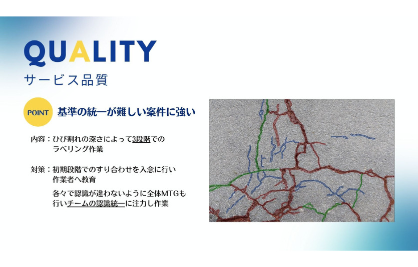 特にサンプル作成や潜在的な要件の洗い出しに力を入れており作業者の主観が入ってしまうような基準の統一が難しい条件や細かいセグメンテーションを得意としています。