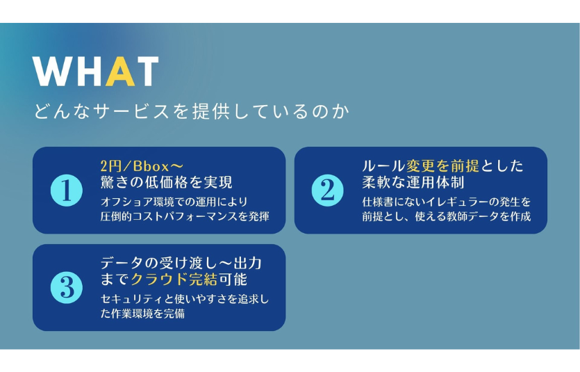オフショア環境による圧倒的なコストパフォーマンス(2円~/Bbox)と数々のBPO業務から培ったプロジェクト体制による高品質なデータ作成を特徴としたアノテーション代行サービスです。