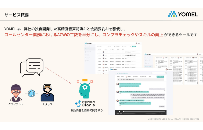 独自開発した高精度音声認識AIと会話要約AIを駆使し、コールセンター業務におけるACWの工数を半分にし、コンプラチェックやスキルの向上ができるツールです。