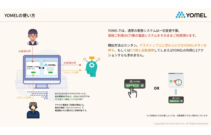 もしくはCTI側と自動連携してしまえば、YOMELの利用に1アクションすらも求めません。